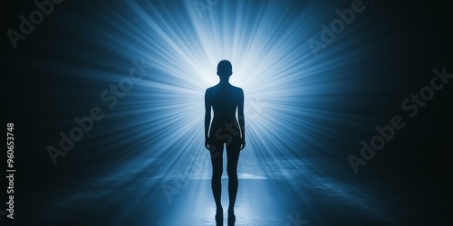 A silhouette of a woman standing in a blue light.