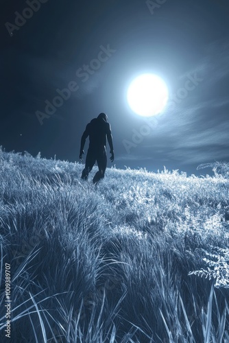 A silhouetted figure walks through a moonlit landscape, creating a mysterious atmosphere.