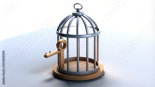 A Silver Birdcage with a Wooden Key Protruding Through the Bars
