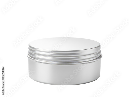 A silver container with a white lid sitting on a white background