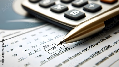 A silver pen resting on a financial document with a calculator in the background.