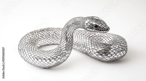 A silver wire snake sculpture coiled in a defensive posture on a white background.