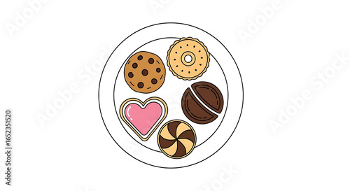 A Simple and Colorful Vector Illustration of Assorted Cookies, Including Chocolate Chip, Heart-Shaped, and Swirl Patterns, Served on a White Plate, Perfect for Baking and Sweet Treat Concepts.