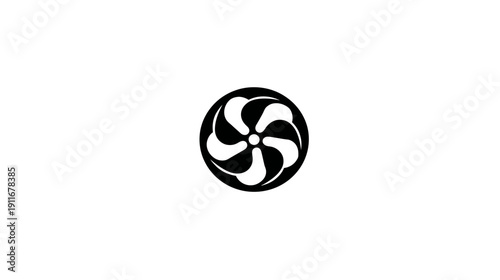 A simple black and white circular design features six curved petals within a surrounding ring