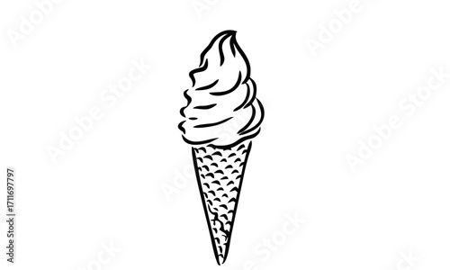 A simple black and white line art illustration of a soft serve ice cream in a waffle cone.