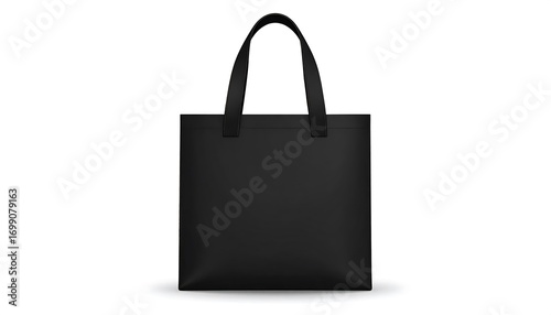A simple, black tote bag with handles is presented against a pure white background.