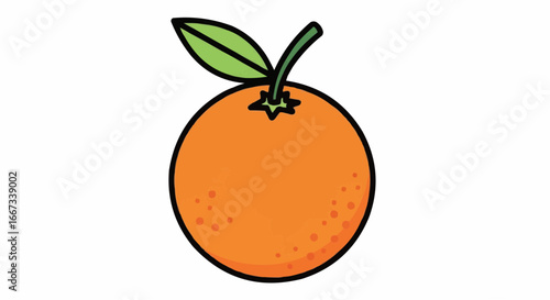 A simple cartoon illustration of a whole orange with a green stem and leaf, depicted against a white background.