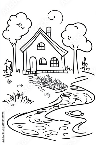 A simple line drawing of a house with a path leading to it, surrounded by trees and a stream.