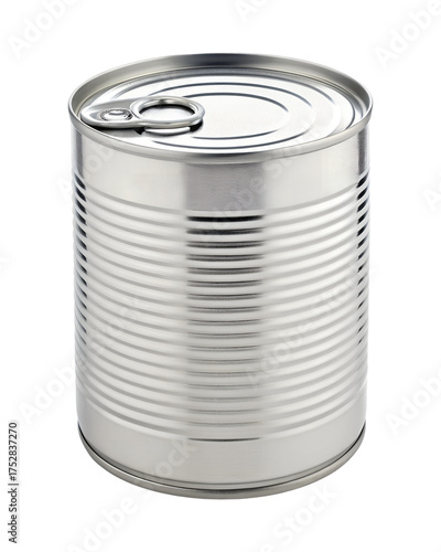 A simple shiny silver metal food can stands upright, sealed with a pull tab, an isolated transparent png for easy placement.
