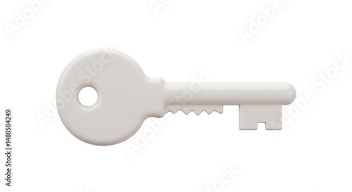 A simple white key isolated on a white background with a hole in the head and jagged edges on the side