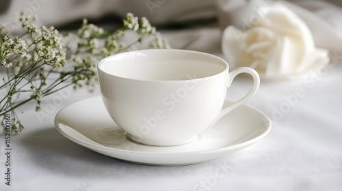 A simple white porcelain teacup with a saucer, placed on a white table