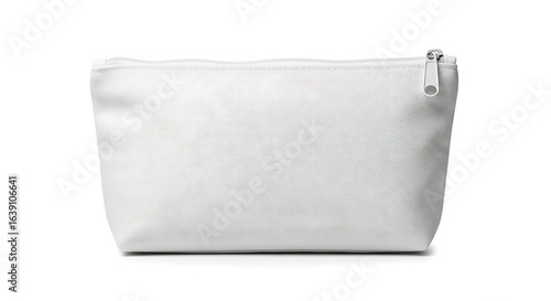 A simple white zippered pouch, used as a cosmetic or makeup bag, isolated against a clean white background.