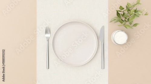 A Simple Yet Elegant Table Setting Featuring Modern Dining Utensils, Empty Plate, and a Jar of Dairy Product, Perfect for a Minimalist Dining Experience.
