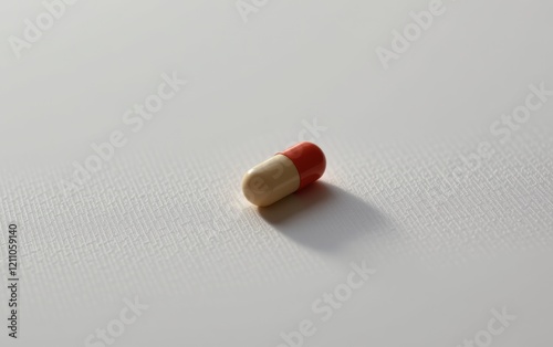 A single capsule pill resting on a clean white surface, casting a subtle shadow.