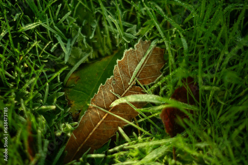 A single autumn leaf beautifully positioned among the lush, vibrant green grass below it