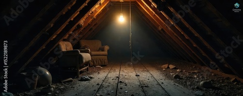 A single bare bulb illuminates a dark, dusty attic space, casting long shadows and highlighting forgotten objects The scene evokes mystery and a sense of timelessness , contrast, crate, bare