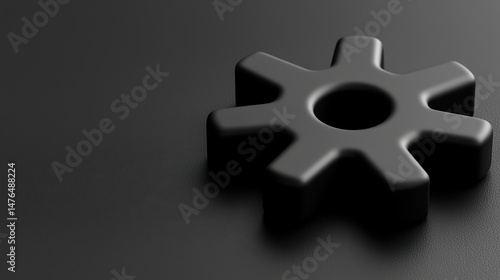 A single black gear lies on a dark textured surface, casting a subtle shadow under dramatic lighting.