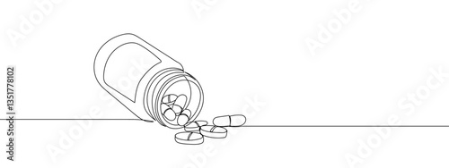A single continuous line, a pill bottle being poured out line art vector business illustration with transparent background editable stroke.