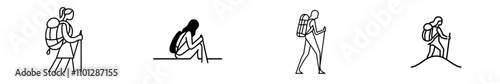 A single continuous line drawing of travelers with backpacks. An artwork of a woman successfully hiking to the top of a mountain in one line. Modern illustration.