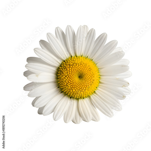A single daisy flower with white petals and a yellow center viewed from directly above