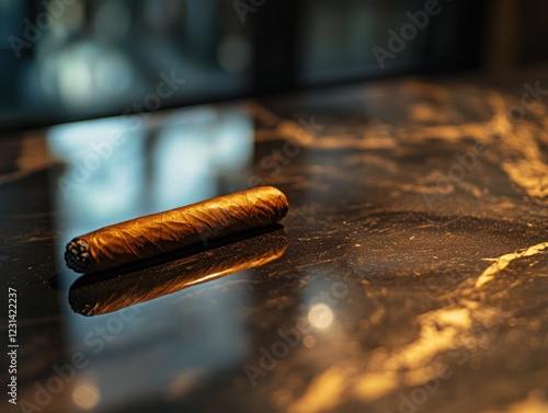 A single, dark brown cigar rests on a polished black marble surface, its reflection visible.