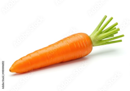 A single fresh orange carrot with green stem lies on a white surface in studio shot