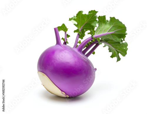 A single fresh purple kohlrabi cabbage turnip with vibrant green leaves, isolated on a clean white background, ready for cooking