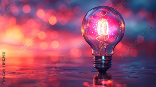 A single glowing light bulb stands on a reflective surface with a blurry pink and purple background