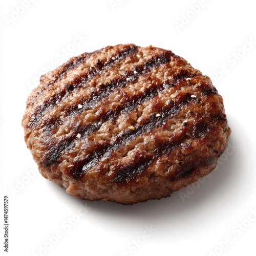 A single grilled hamburger patty on white background, grilled burger patty, cooked hamburger patty, burger patty white background, grilled hamburger patty isolated, ground beef patty, easy to cutout