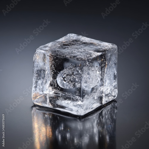 A single ice cube with trapped air bubbles, reflecting light on a dark surface