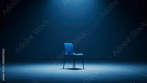 A single, isolated blue chair dramatically spotlit in a dim, blue-lit concrete room, embodying stark minimalism.