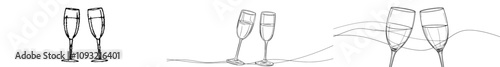 A single line drawing of two champagne glasses clinking. A creative illustration of sparkling wine glasses, featuring continuous lines in a modern banner style. Ideal for parties, anniversaries, and