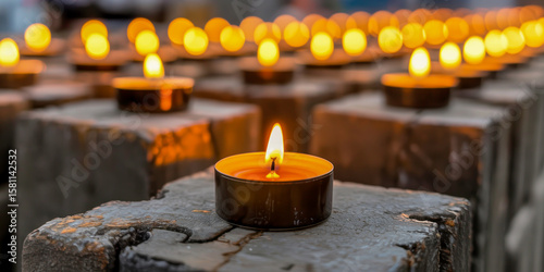 A single lit candle stands out amongst many out of focus candles
