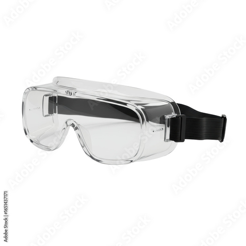 A single pair of transparent industrial safety goggles with sturdy frame and elastic head strap, clear polycarbonate, isolated on a transparent background with shadowless lighting, high contrast,