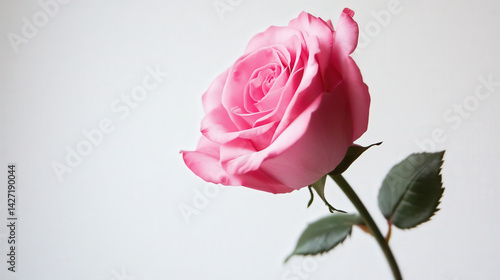 A single pink rose is standing upright on a white background