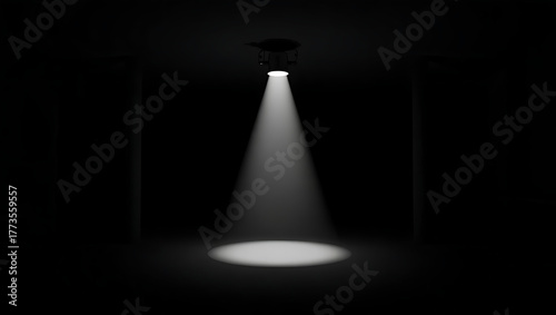 A single powerful spotlight illuminates a dark stage creating dramatic contrast and highlighting an unseen focal point with atmospheric lighting effects