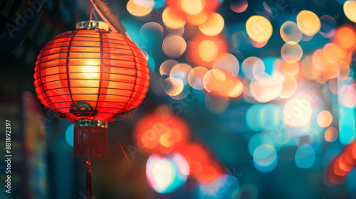 A single red lantern glows brightly in focus, with colorful bokeh lights in the background, offering a glimpse of a festive night scene filled with vibrant energy.