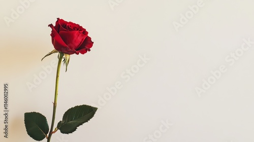 A single red rose set against a soft cream background, close-up shot, Minimalist style
