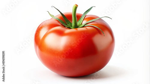 A single, ripe red tomato with a green stem sits on a white background