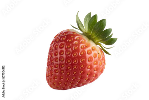 A single, ripe strawberry with green leaves, isolated on a transparent background. background removed