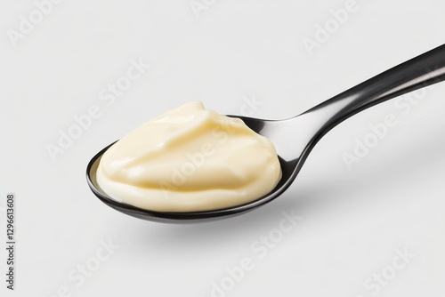 A single spoonful of yoghurt floating in mid-air with a white background
