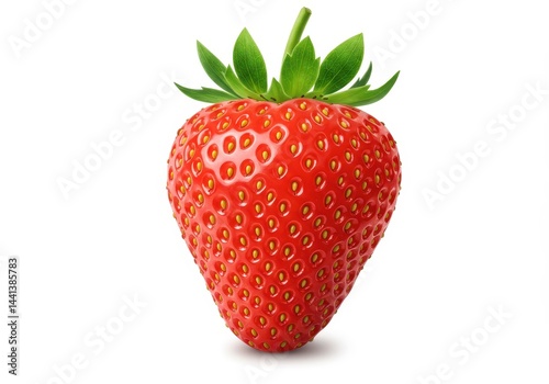 A single strawberry with green leaves on top isolated against a plain white background studio shot