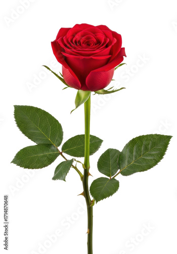 A single vibrant red rose with velvety crimson petals, a green thorny stem, and glossy leaves, macro close-up on a transparent studio background with copy space, concept of classic beauty and love