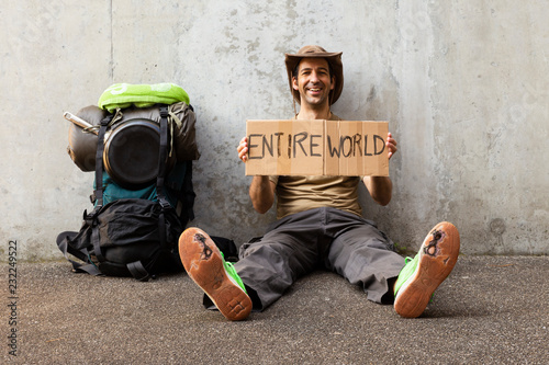 A single white adult man with a packed backpack sitting on the roadside in front of a gray wall wearing broken green shoes and holding a cardboard sign reading entire world