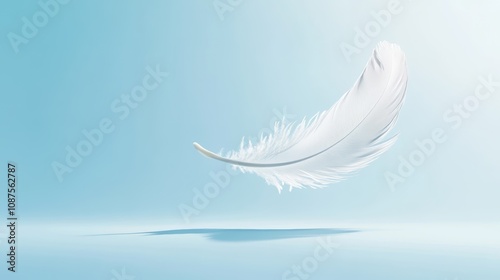 A single white feather floats in mid-air against a light blue background. The feather casts a shadow on the surface below.