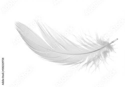 A single white feather isolated on a white background in a studio shot with soft lighting
