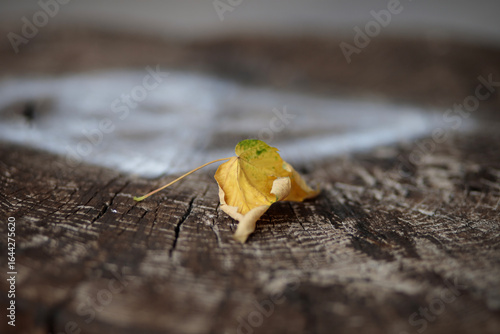 A single yellow autumn leaf resting on rustic wooden surface, symbolizing fall.