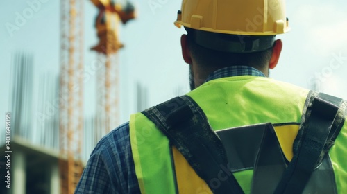 A site manager inspecting safety gear on workers at a construction site. Featuring safety and compliance