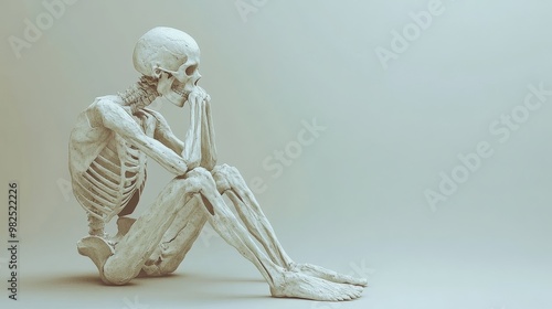 A skeleton is sitting on the ground with its hands clasped in its lap