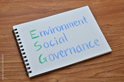 A sketchbook with "Environment, Social, Governance" written on it is placed diagonally on a wooden board.